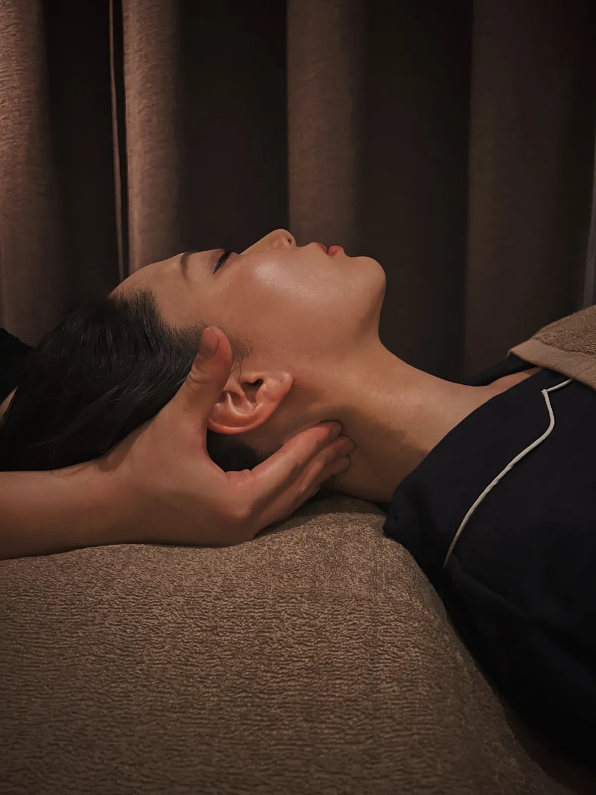 強く押さず、呼吸のリズムに合わせて深く沈み込む指圧・ツボの技術で、首・肩・脚までやさしくほぐします。